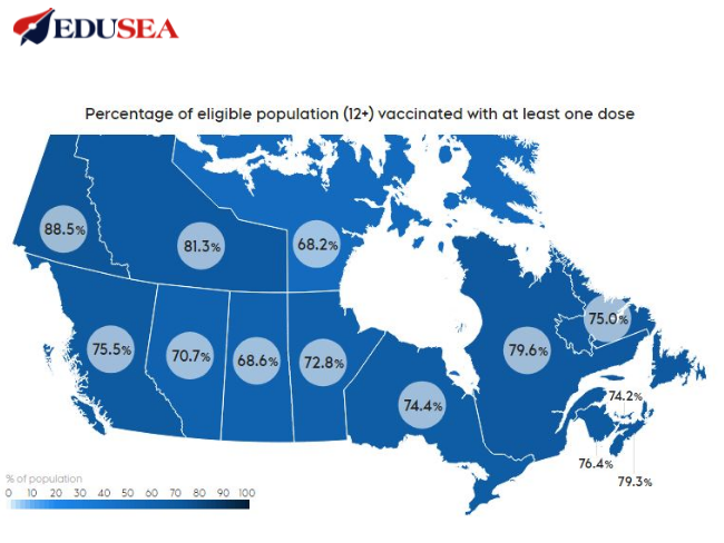 Hiện tất cả người dân từ đủ 12 tuổi trở lên đã đủ điều kiện để nhận vaccine Covid-19 ở Canada, kể cả du học sinh. Bốn loại vaccine đang được tiêm chủng gồm Moderna, Pfizer-BioNTech, AstraZeneca và Janssen (Johnson & Johnson).